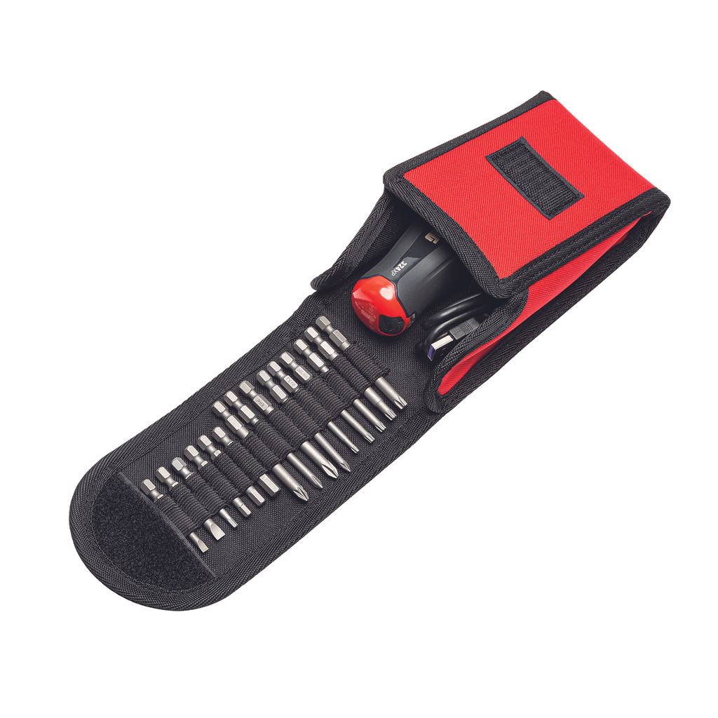 - Assortimento con inserti lunghi, giravite elettrico ed astuccio in tessuto