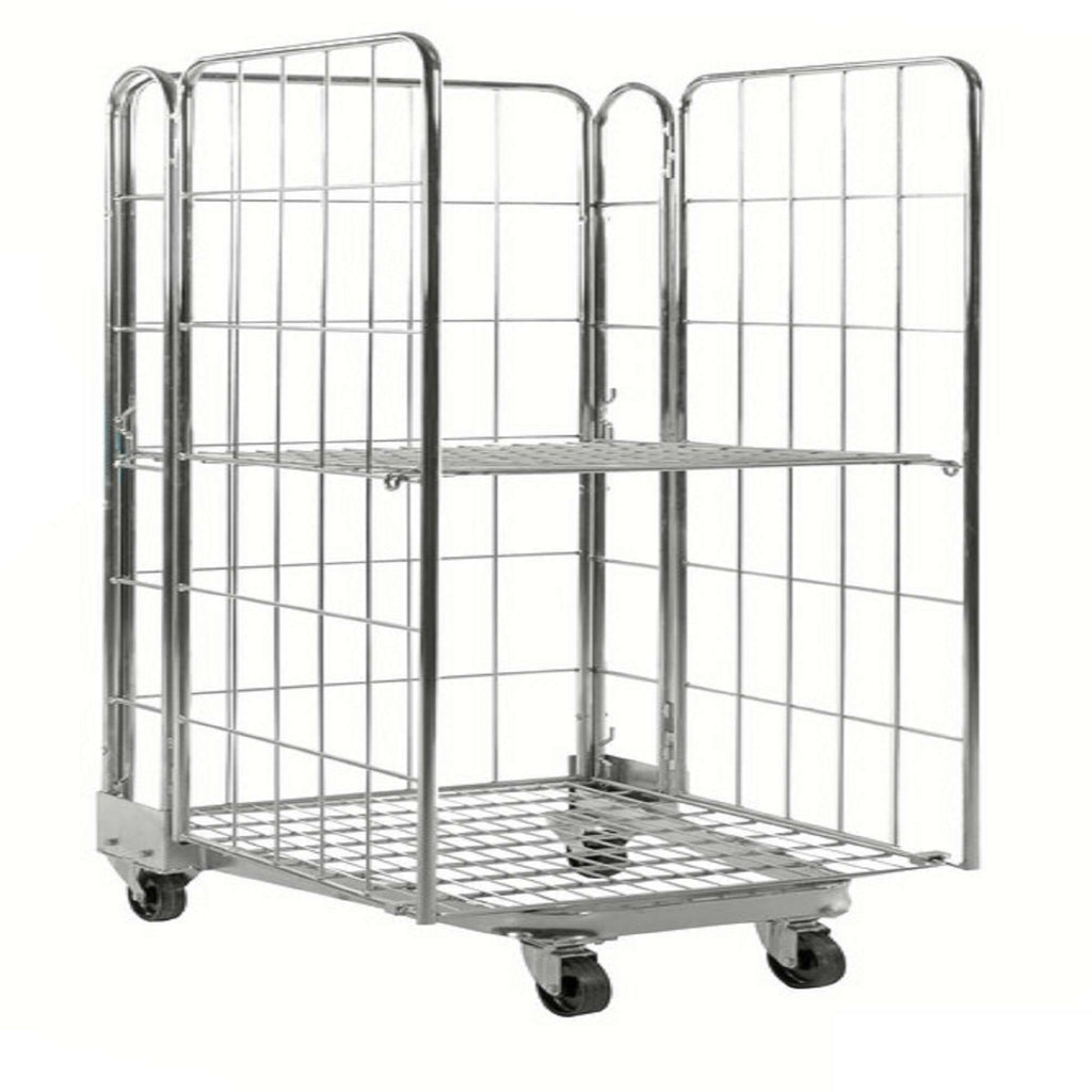 Roll container sovrapponibile con 3 sponde e un ripiano nella versione standard. Disponibile in varie versioni