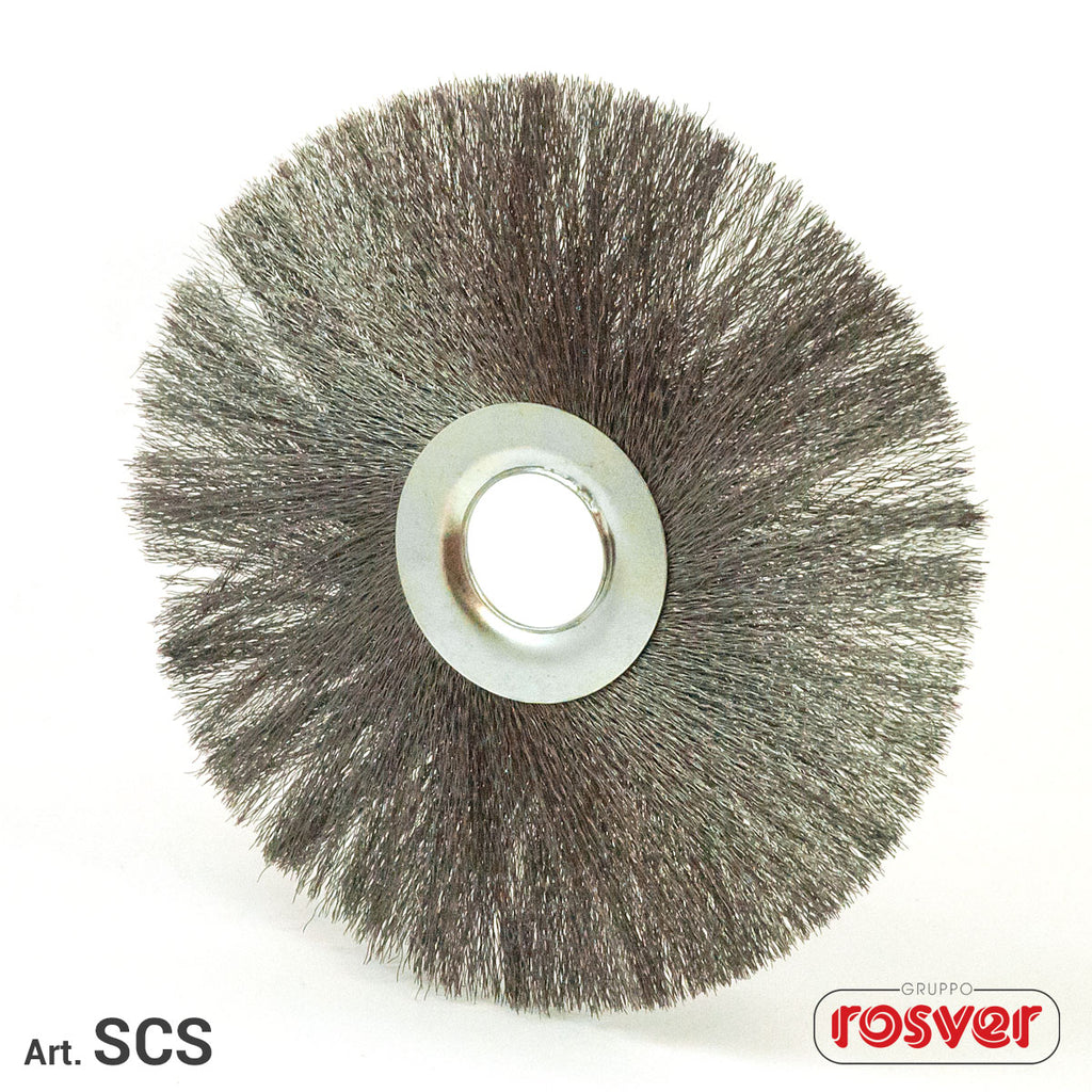 Per spazzolatura fatta con macchine stazionarie e mole da banco. Solo le punte del filo devono entrare in contatto con il pezzo da lavorare. Molto resistente, lunga durata, lavoro aggressivo. Si possono accoppiare.